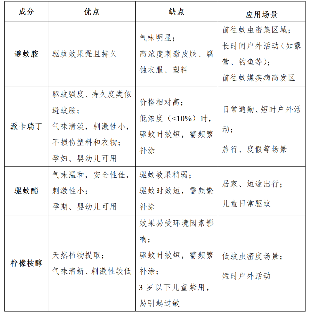 二是看成分:产品外包装应标注有效驱蚊成分及浓度,各驱蚊成分优缺点及应用场景对比: